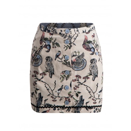 Der etwa bis zur Mitte der Oberschenkel reichende Rock hat einen femininen Sitz in der Taille und wurde mit einer Logo-Knopfreihe in der vorderseitigen Mitte ausgestattet. Die beiden schrägen Paspeltaschen auf Hüfthöhe ergänzen den kurzen Taillenrock mit einer Prise Bewegungsfreiheit und können mittels kleiner Knöpfchen sogar verschlossen werden. Der Saum des Schönlings wurde mit einem farblich kontrastierenden Wellenband garniert, sodass es auch an Detail-Liebe nicht mangelt. Textil mit Stil…
